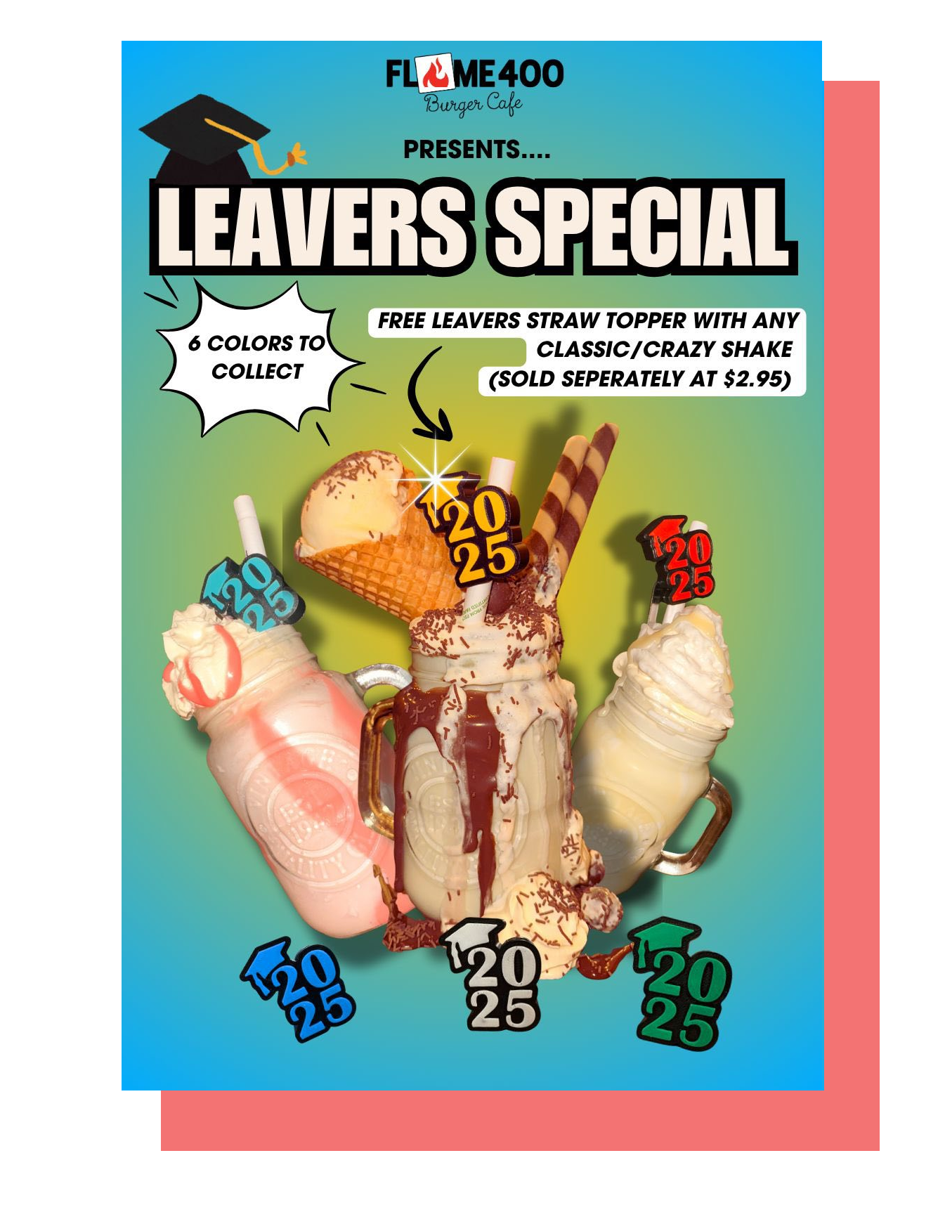 To celebrate Leavers Season, we’re giving away a FREE straw topper with a Classic or Crazy Shake purchase. It’s our way of saying CONGRATS to all the grads—you made it! These collectible toppers (worth $2.95) are FREE for a limited time, so grab yours before they’re gone.