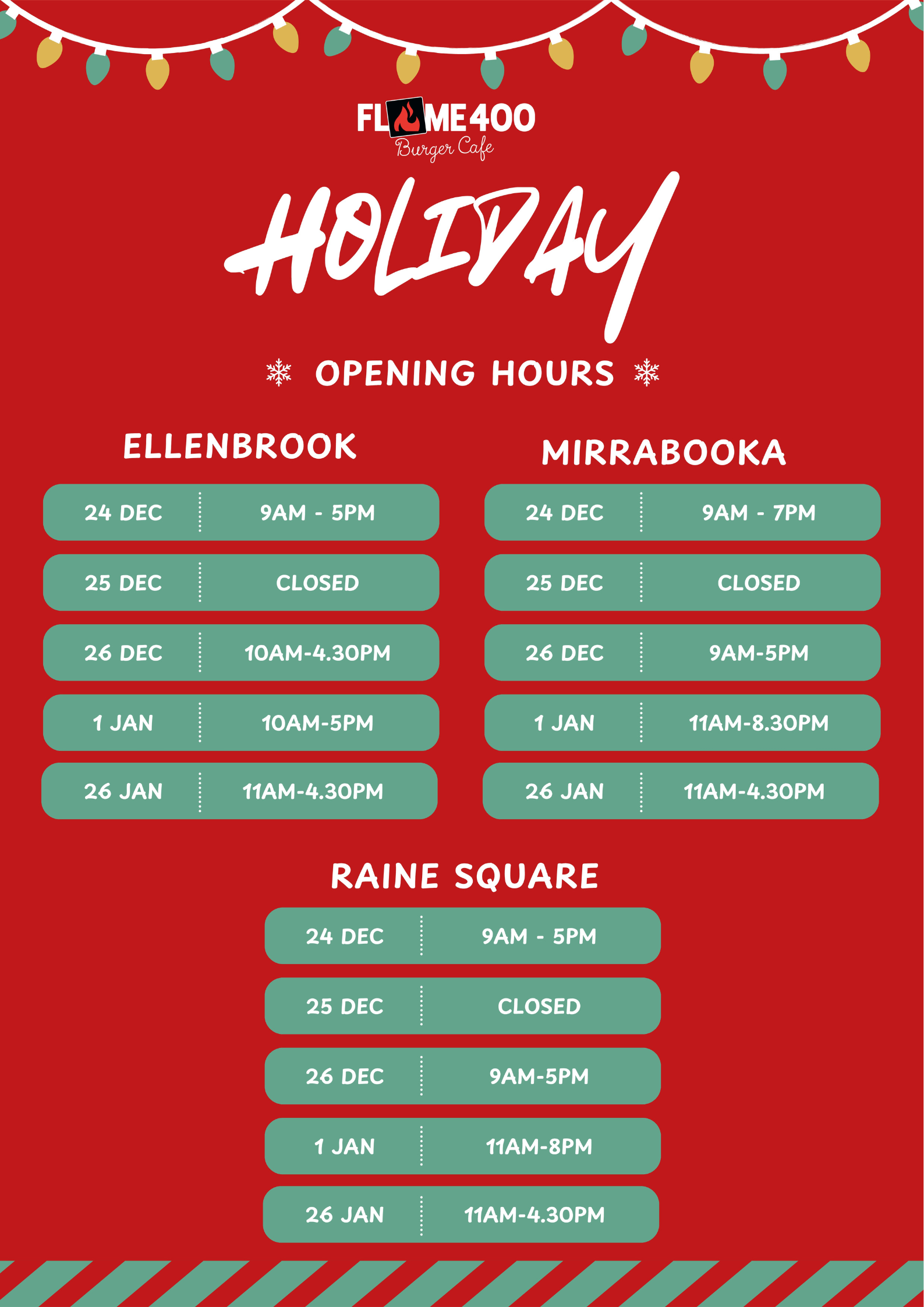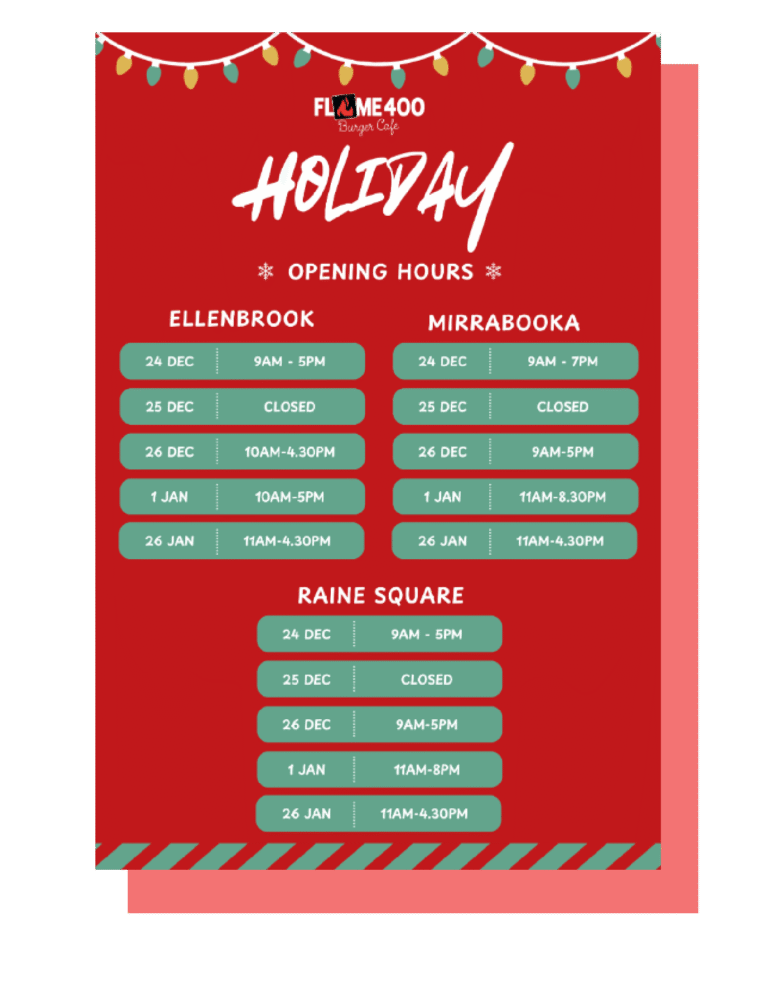 Celebrate the holidays with Flame 400! Please see our special trading hours across all locations this festive season. Whether you’re visiting Ellenbrook, Mirrabooka, or Raine Square, we’re here to serve you with your favorite Flame 400 flavours.