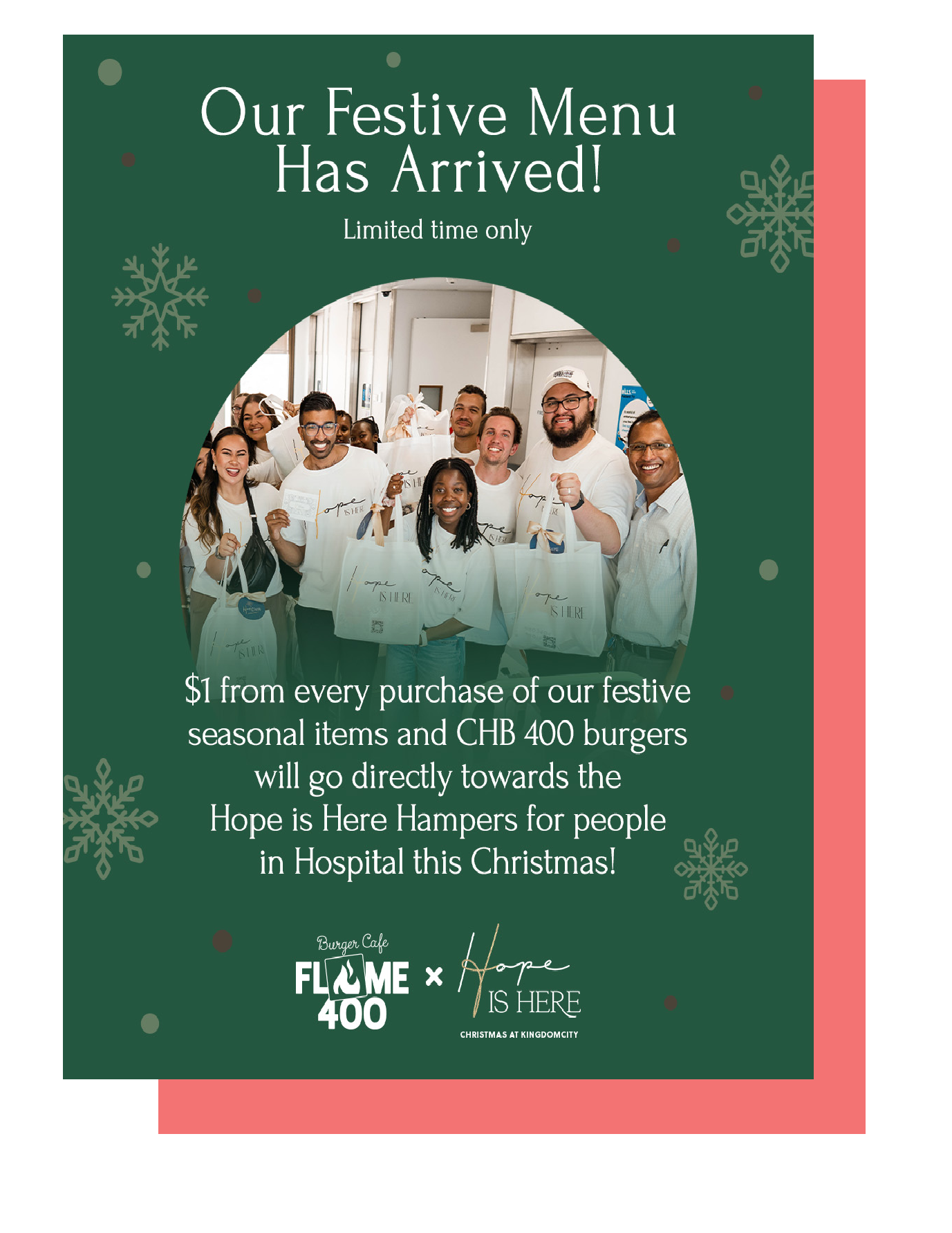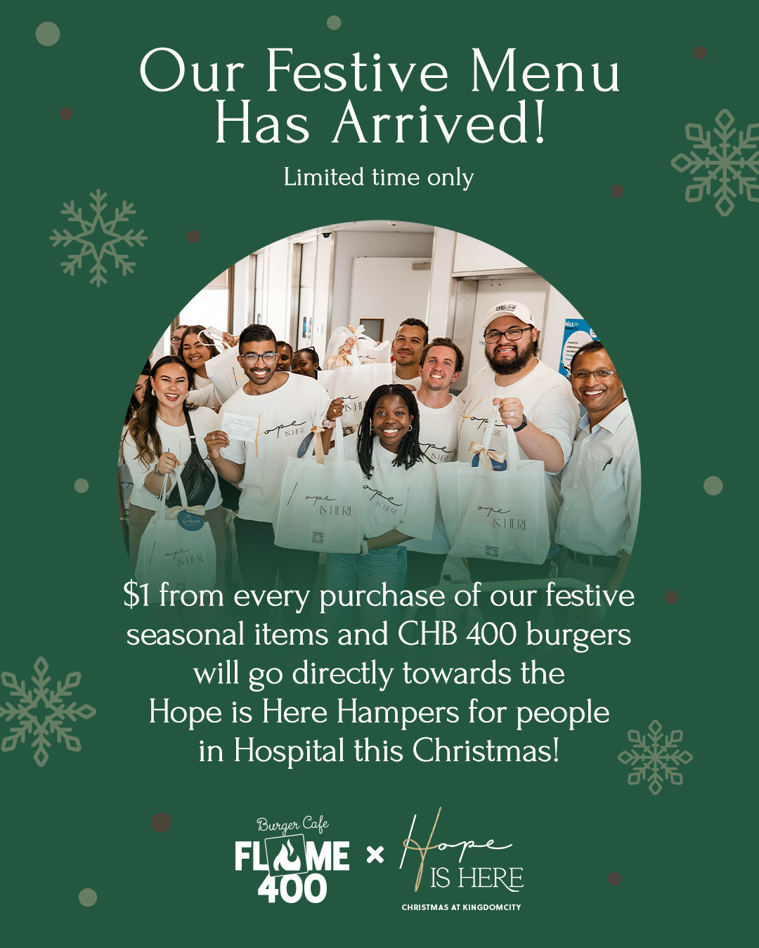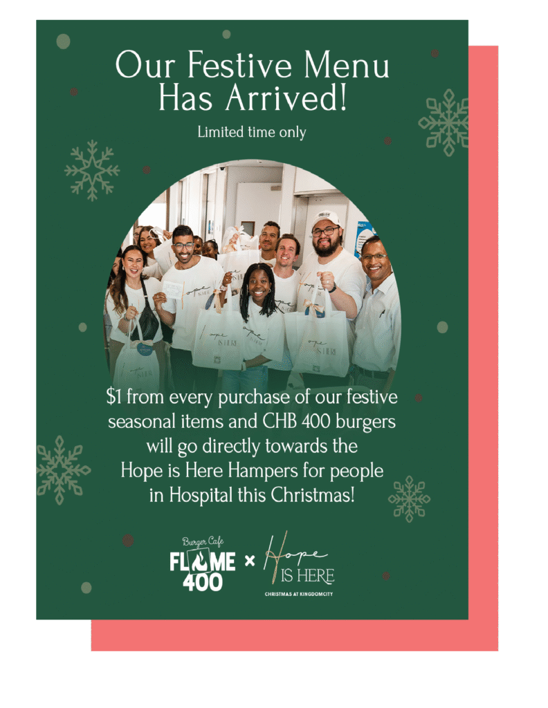 When you order from our Festive Menu and CHB 400 Burgers, $1 goes toward “Hope Is Here Hampers”—filled with encouragement, essentials, and love for hospital patients.